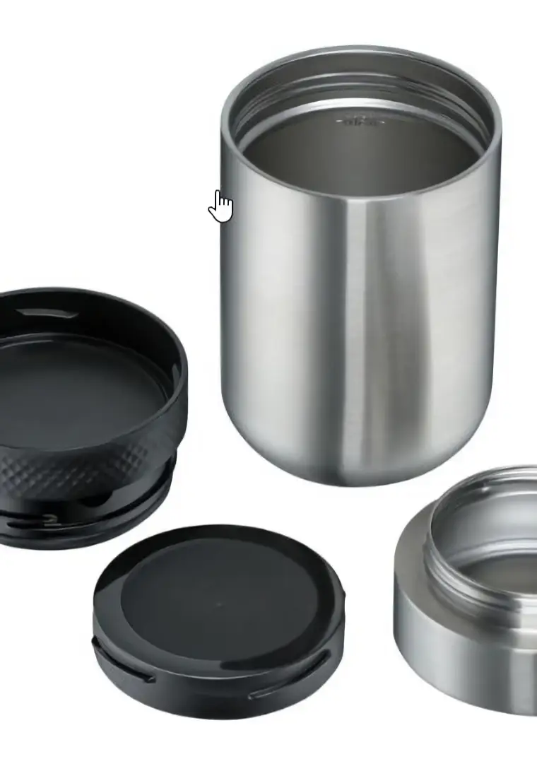 Prezentowany termos obiadowy My2Go o wymiarach 9,5 x 18 cm (śr. x wys.) wykonany został ze stali nierdzewnej 18/10 Cromargan w matowym wykończeniu i tworzywa sztucznego w czarnym kolorze. Produkt składa się z 2 pojemników: głównego na posiłek (0,5 l) oraz mniejszego na grzanki / musli itp. (0,2 l). Dzięki podwójnym ściankom (izolacja ThermaPro) jest on w stanie utrzymać wysoką temperaturę przez 6 h, a niską przez 12 h, będąc jednocześnie komfortowym w trzymaniu. Szczelność z kolei pozwala na bezpieczne transportowanie posiłku w torbie lub plecaku (zalecane jest przenoszenie w pionie). Dodatkową zaletą termosu jest możliwość mycia zarówno ręcznie jak i z pomocą zmywarki.