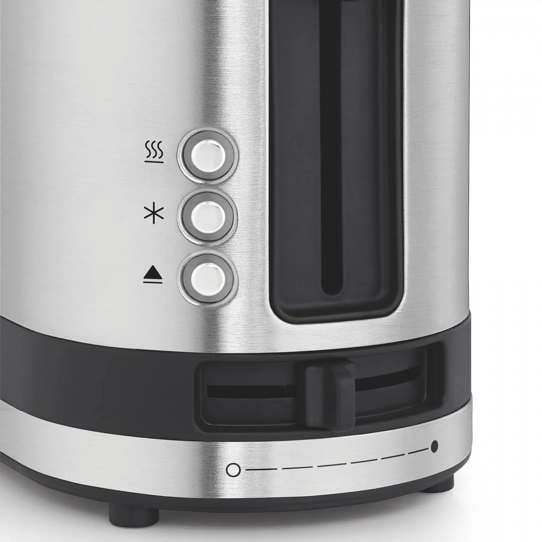 Toster Kitchenminis wykonany ze stali nierdzewnej Cromargan®, posiada 7 stopni brązowienia, podświetlane przyciski funkcyjne i zintegrowany system wypośrodkowywania chleba dla jego równomiernego opiekania. W zestawie ruszt do podpiekania croissantów, rogalików czy bułek. Wysuwana tacka na okruchy sprawia, że toster jest łatwy do utrzymania w czystości. Doskonale przypieczone pieczywo podasz na talerz dzięki wykorzystaniu eleganckiego i niezawodnego tostera marki WMF.