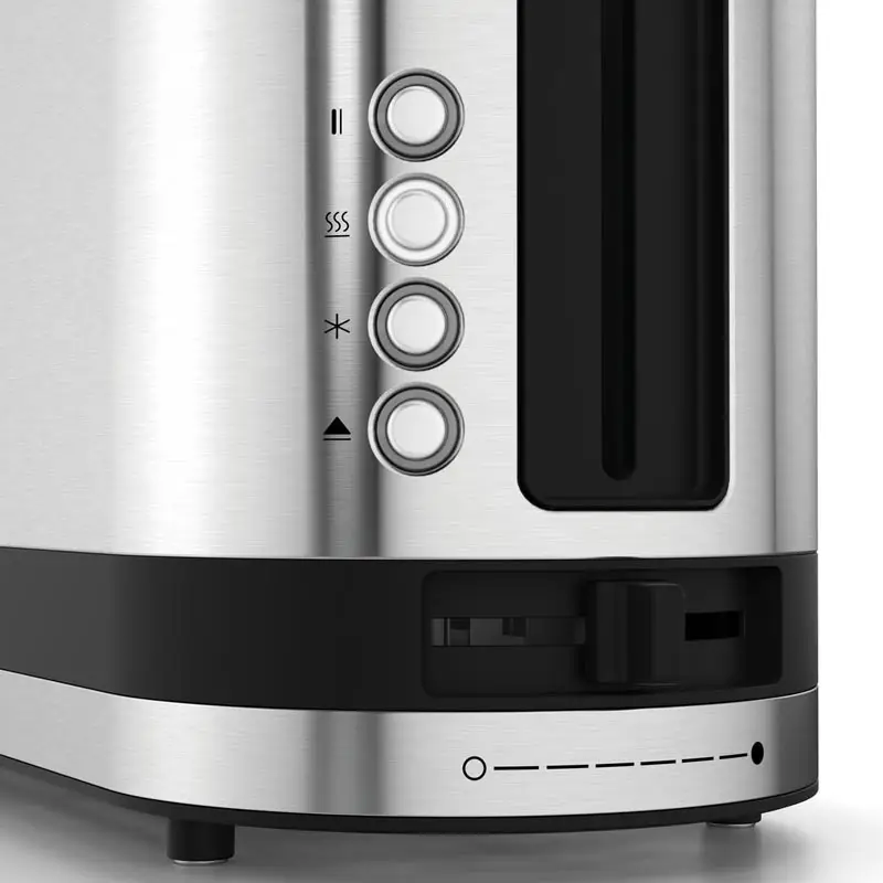 Koniec kłopotów z opiekaniem długiego pieczywa, jak kromki chleba rodzinnego. Rozwiązaniem jest Toster KitchenMinis Long Slot, który wykonany ze stali nierdzewnej Cromargan®, posiada 7 stopni brązowienia, podświetlane przyciski funkcyjne i zintegrowany system wypośrodkowywania chleba dla jego równomiernego opiekania. W zestawie ruszt do podpiekania croissantów, rogalików czy bułek. Wysuwana tacka na okruchy sprawia, że toster jest łatwy do utrzymania w czystości.