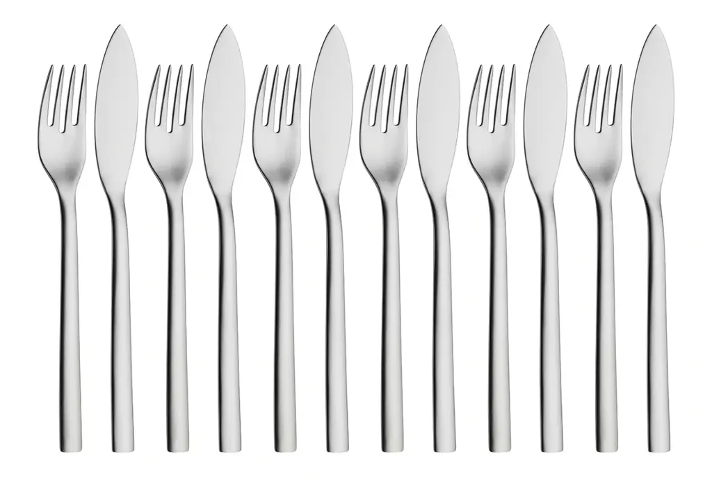 Zestaw 12 sztućców specjalnie dedykowany do ryb przeznaczony dla 7 osób. Wyprofilowane i szerokie ostrza noży ułatwią oddzielanie mięsa od ości. Charakteryzuje się zaokrąglonymi krawędziami i smukłymi rękojeściami. Sztućce zostały wykonane ze stali nierdzewnej Cromargan - niezwykle odpornej na działanie kwasów spożywczych jak i innych czynników zewnętrznych.