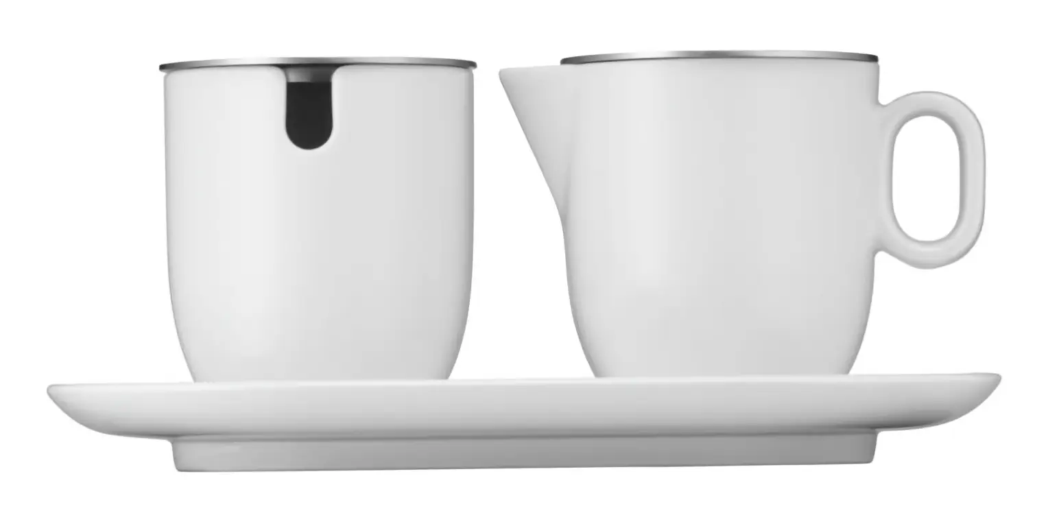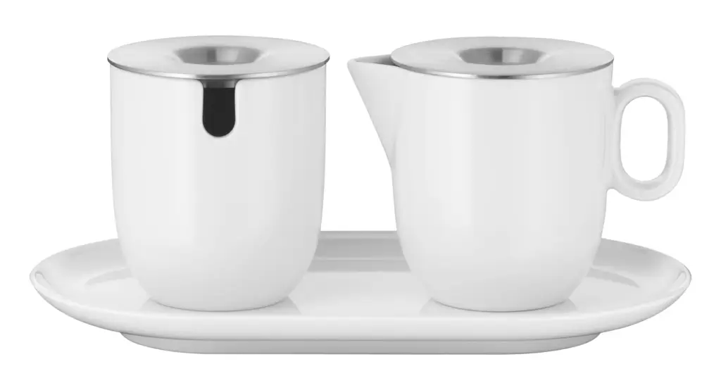 Prezentowany zestaw zawiera cukiernicę i dozownik do mleka lub śmietanki w komplecie ze spodkiem, które będzie można wygodnie postawić na stoliku podczas serwowania kawy w gronie rodziny lub znajomych. Wykonano go w Niemczech z wysokiej jakości porcelany w białym kolorze oraz stali nierdzewnej Cromargan (pokrywki), która nie tylko wspaniale wykańcza, ale i jest odporna m.in. na rdzę i zarysowania. Pokrywki te poza dodawaniem atrakcyjności wizualnej uchronią cukier i mleko/śmietankę przed zabrudzeniami z zewnątrz. Antypoślizgowe wypustki na spodach zapewniają stabilność zestawu, a podniesione krawędzie podstawki wyłapują przypadkowo rozlane płyny. Cukiernica posiada otwór na łyżeczkę. Dozownik na mleko wyposażono w ergonomiczny uchwyt zapewniający komfort używania oraz dzióbek do bezproblemowego przelewania. Ponadto niewątpliwą zaletą zestawu jest możliwość mycia w zmywarce, co przełoży się na wygodę i łatwość w utrzymaniu go w czystości.