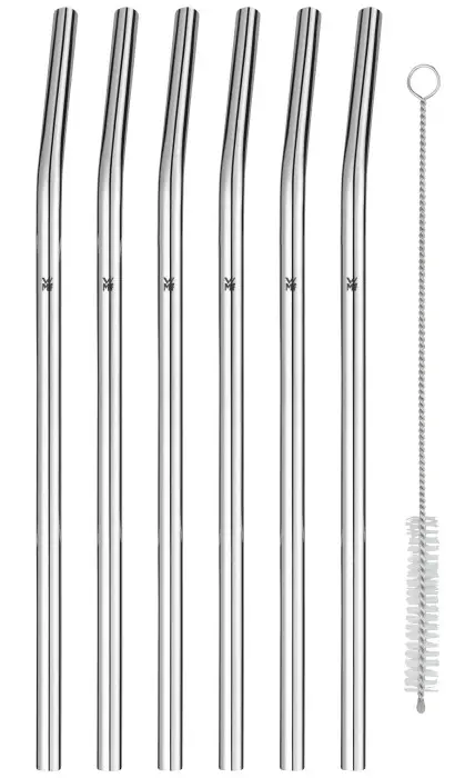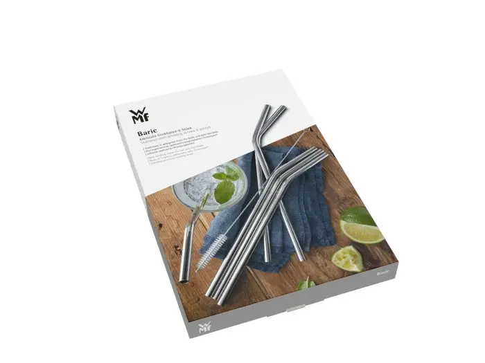 Komplet słomek od niemieckiej firmy WMF z kolekcji Baric który jest idealną alternatywą dla plastikowych słomek zapewniając przy tym większą higienę dzięki zamieszczonej w komplecie szczoteczki do czyszczenia. Mimo wykonania z metalu słomki dalej zachowały tradycyjny kształt z lekkim zagięciem na czubku.