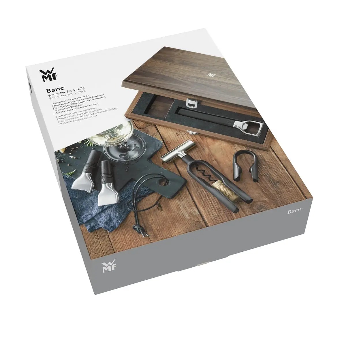 Wyposażony w pięć elementów zestaw Baric od niemieckiej firmy WMF wyposażony został w elementy idealne dla wszystkich miłośników win, dodatkowo otrzymają Państwo stylową skrzynkę na wszystkie produkty.