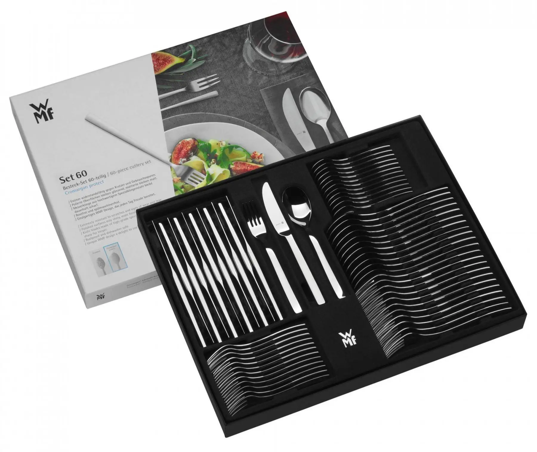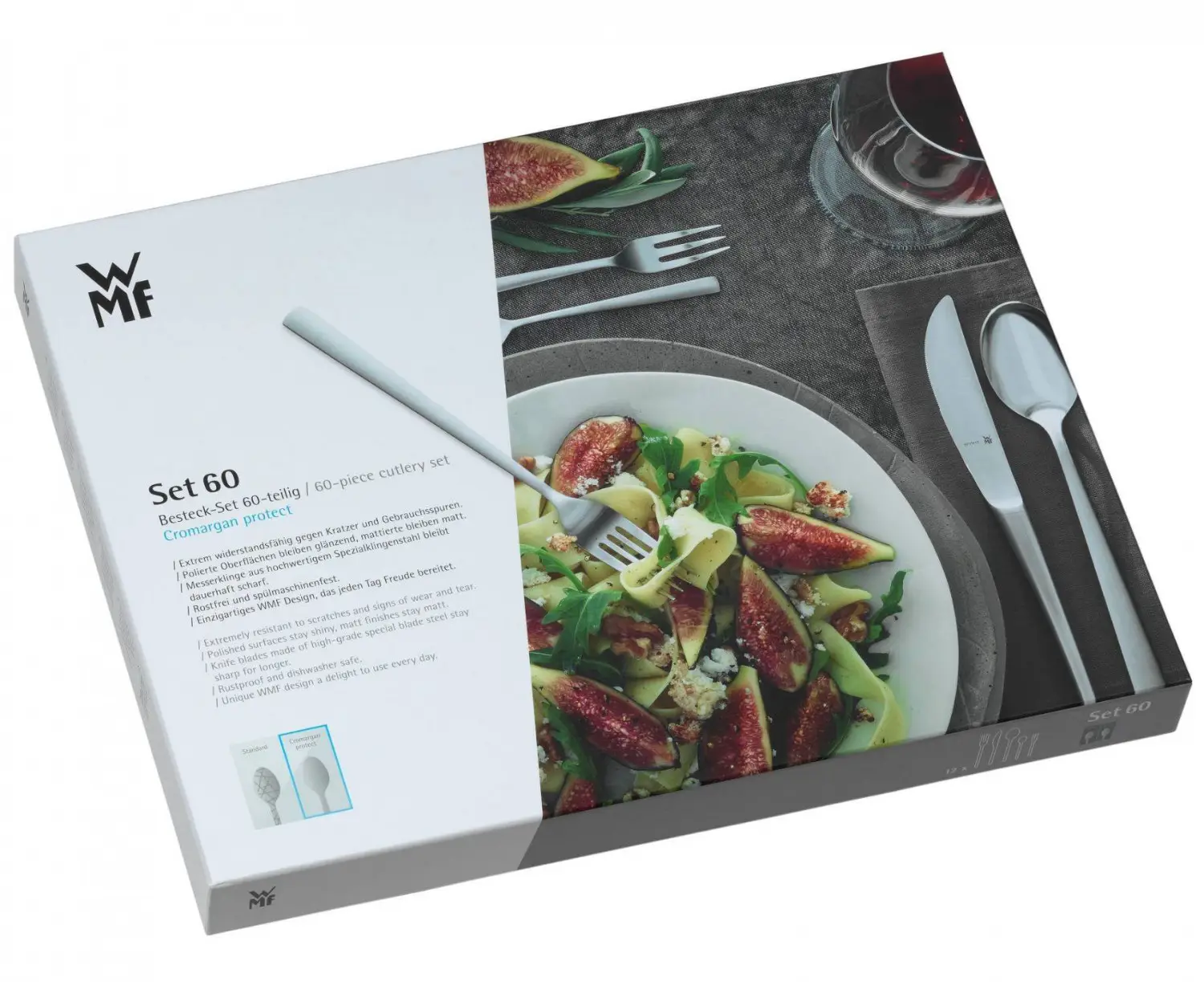 Prezentowany zestaw 60 sztućców Palermo zawiera 12 łyżek, 12 widelców, 12 noży, 12 widelczyków do ciast i 12 łyżeczek. Wykonane zostały z wytrzymałej, odpornej na rdzę, kwasy i zarysowania polerowanej stali nierdzewnej Cromargan, co zapewni ich praktyczność i długowieczność. Dodatkowo można je myć w zmywarce. Zaprojektowane zostały w współczesnych proporcjach i wymiarach, mają wyraźne kontury, a ich końce są proste. Noże wchodzące w skład zestawu odkute są z jednego kawałka metalu i w całości hartowane. Zestaw ten idealnie sprawdzi się jako podstawa w kuchni do spożywania codziennych posiłków, a także w połączeniu z innymi naczyniami umożliwi stworzenie jednolitej i eleganckiej zastawy stołowej w przypadku rodzinnych okazji, czy spotkań w większym gronie znajomych.