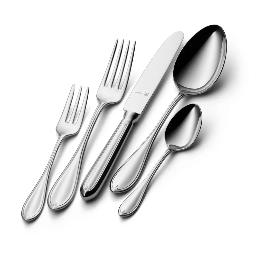 Przedstawiony komplet sztućców z eleganckiej kolekcji Premiere dla 12 osób wyróżnia się klasycznym kształtem, gdzie rękojeść tworzy delikatną formę liścia. Sztućce z tej kolekcji idealnie nadadzą się do codziennego spożywania posiłków, a pomimo swojej klasycznej formy, sztućce z pewnością będą dobrze komponować się z innymi elementami Twojej zastawy. Wszystkie elementy kompletu są przystosowane do mycia w zmywarce.
