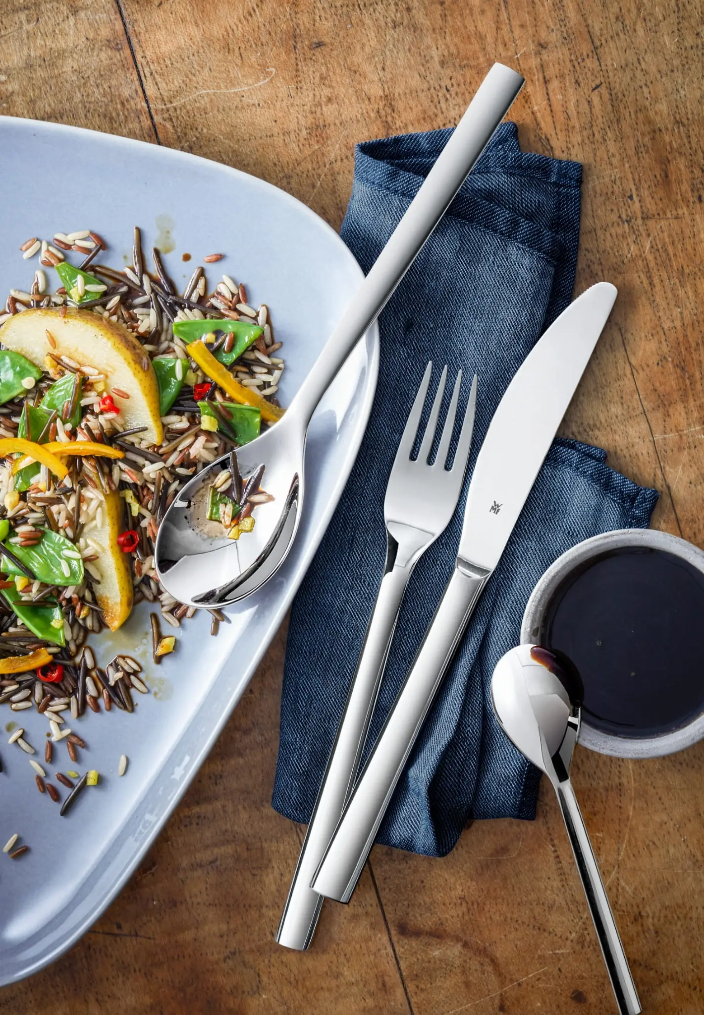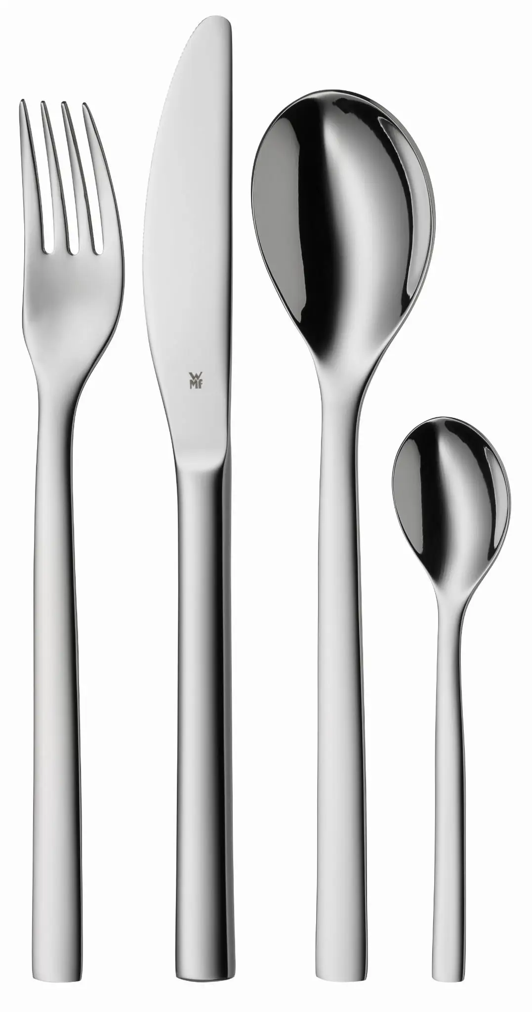 Zestaw Nuova od niemieckiej firmy WMF to nowoczesny design, seria ta będzie doskonałym wyborem w codziennym użytkowaniu. Wykończenie sztućców jest polerowane oraz wykonane z najwyższej jakości stali co sprawia, że kolekcja cechuje się wysoką solidnością oraz zagwarantuje przy tym długotrwałe użytkowanie produktów. Sztućce z serii Nuova nadają się do mycia w zmywarce.