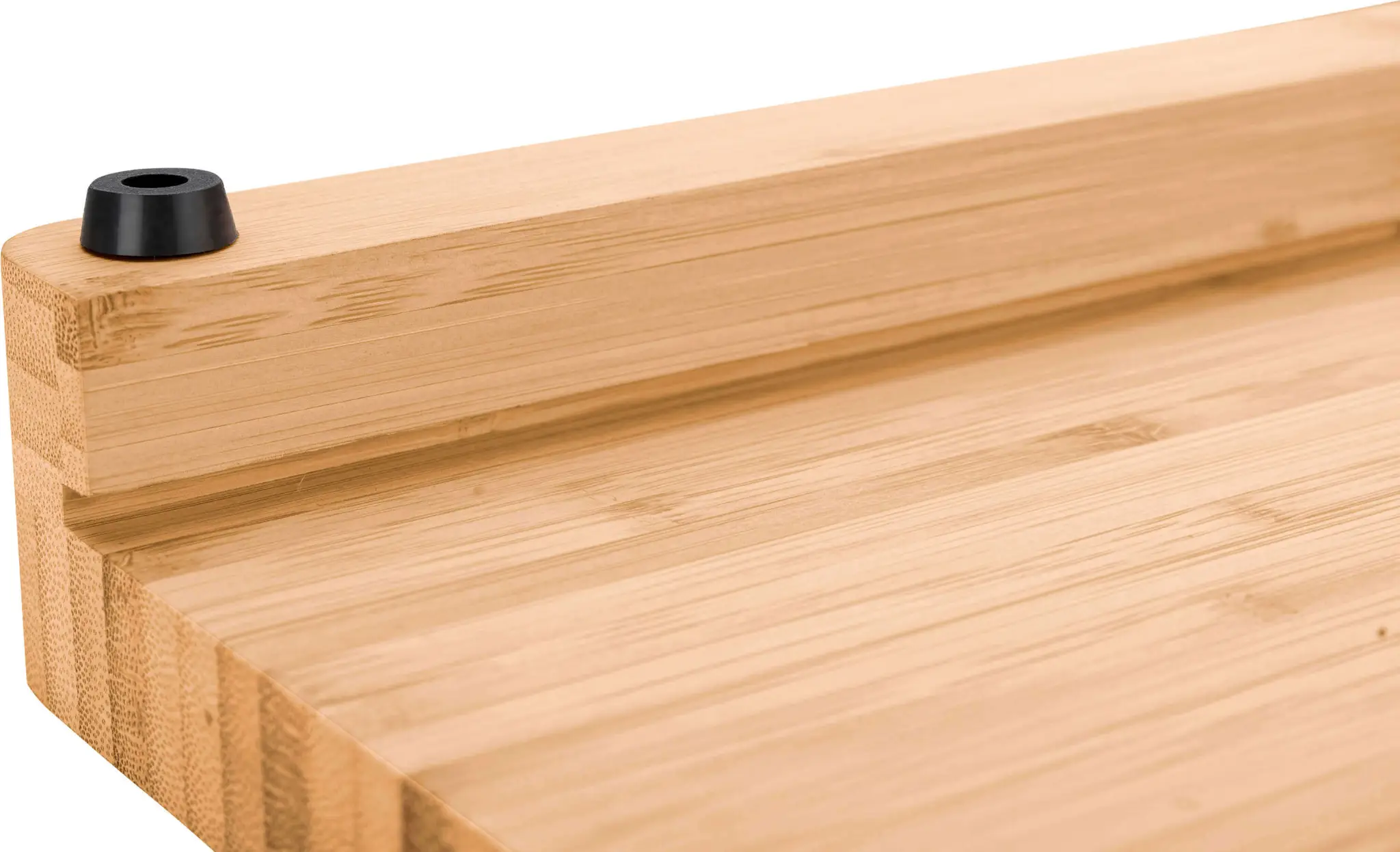 Dzięki rowkowi odprowadzającemu soki i wysuwanej tacy zbierającej odpady, blat kuchenny pozostaje czysty. Antypoślizgowe gumowe nóżki zapewniają stabilność, a tacka może być bezpiecznie myta w zmywarce.