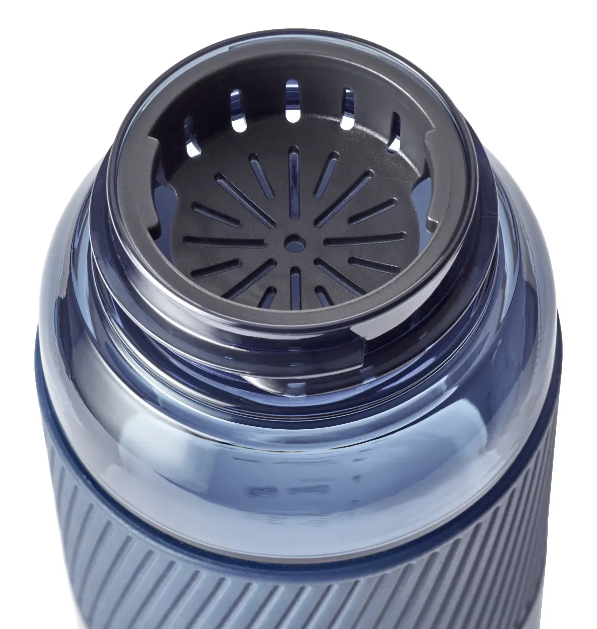 Prezentowany bidon w niebieskim kolorze wykonany został z wytrzymałego, nietłukącego się materiału - tritanu (bezpiecznego dla zdrowia tworzywa sztucznego bez BPA), który jest dodatkowo absolutnie bezwonny i bezsmakowy. Produkt jest łatwy w przenoszeniu. Można go bez trudu zmieścić w torbie lub plecaku, bądź transportować w dłoni lub na nadgarstku, dzięki zdejmowanemu paskowi. Samo trzymanie go w dłoni również będzie bezproblemowe i bezpieczne, zapewnia to antypoślizgowe silikonowe etui na całym obwodzie w górnej części. Komfort przenoszenia gwarantuje ponadto jego stuprocentowa szczelność. Na wygodę używania wpływa też możliwość otwierania jedną ręką. Szeroki otwór z kolei umożliwia łatwe napełnianie bidonu sokiem, herbatą, wodą lub innym niegazowanym napojem. Dodatkową zaletą produktu jest łatwość w czyszczeniu - pustą butelkę należy rozebrać na części i umyć pod bieżącą wodą lub z pomocą zmywarki. W komplecie dołączone zostało praktyczne sitko ułatwiające wlewanie soków owocowych, bez przejmowania się miąższem czy pestkami.