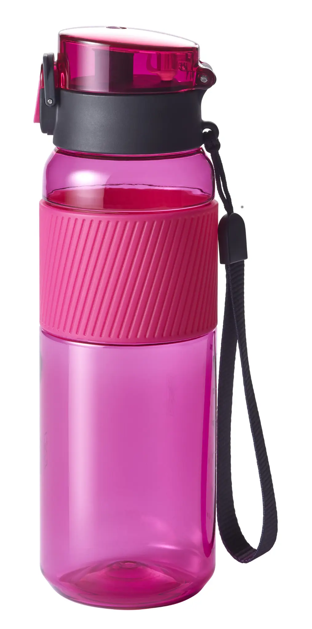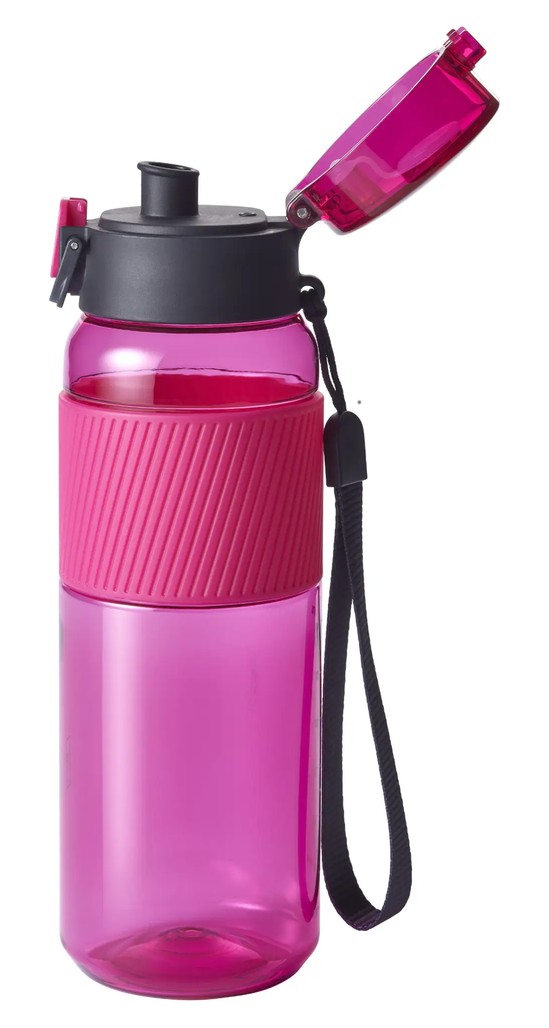 Prezentowany bidon w różowym kolorze wykonany został z wytrzymałego, nietłukącego się materiału - tritanu (bezpiecznego dla zdrowia tworzywa sztucznego bez BPA), który jest dodatkowo absolutnie bezwonny i bezsmakowy. Produkt jest łatwy w przenoszeniu. Można go bez trudu zmieścić w torbie lub plecaku, bądź transportować w dłoni lub na nadgarstku, dzięki zdejmowanemu paskowi. Samo trzymanie go w dłoni również będzie bezproblemowe i bezpieczne, zapewnia to antypoślizgowe silikonowe etui na całym obwodzie w górnej części. Komfort przenoszenia gwarantuje ponadto jego stuprocentowa szczelność. Na wygodę używania wpływa też możliwość otwierania jedną ręką. Szeroki otwór z kolei umożliwia łatwe napełnianie bidonu sokiem, herbatą, wodą lub innym niegazowanym napojem. Dodatkową zaletą produktu jest łatwość w czyszczeniu - pustą butelkę należy rozebrać na części i umyć pod bieżącą wodą lub z pomocą zmywarki. W komplecie dołączone zostało praktyczne sitko ułatwiające wlewanie soków owocowych, bez przejmowania się miąższem czy pestkami.