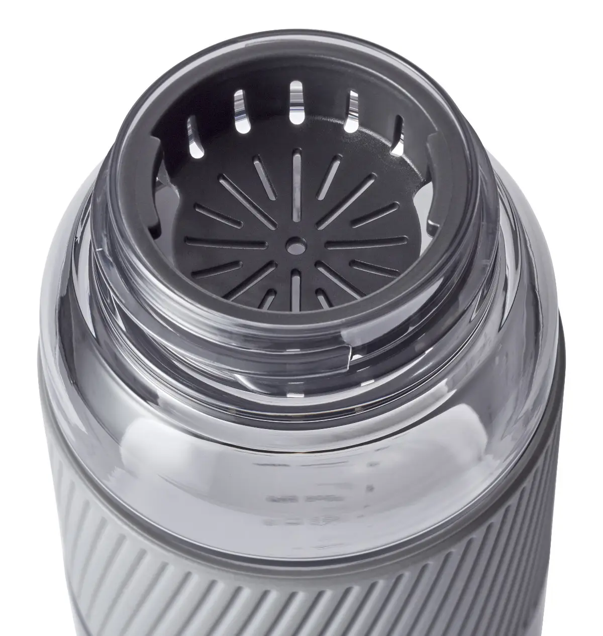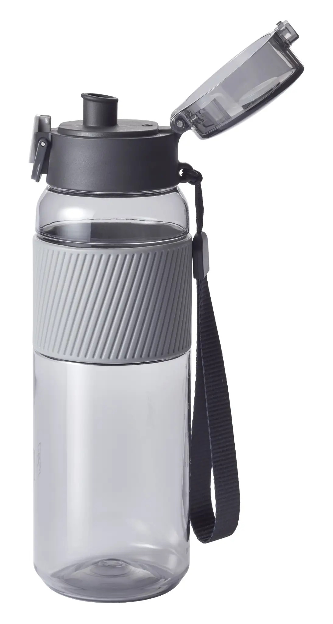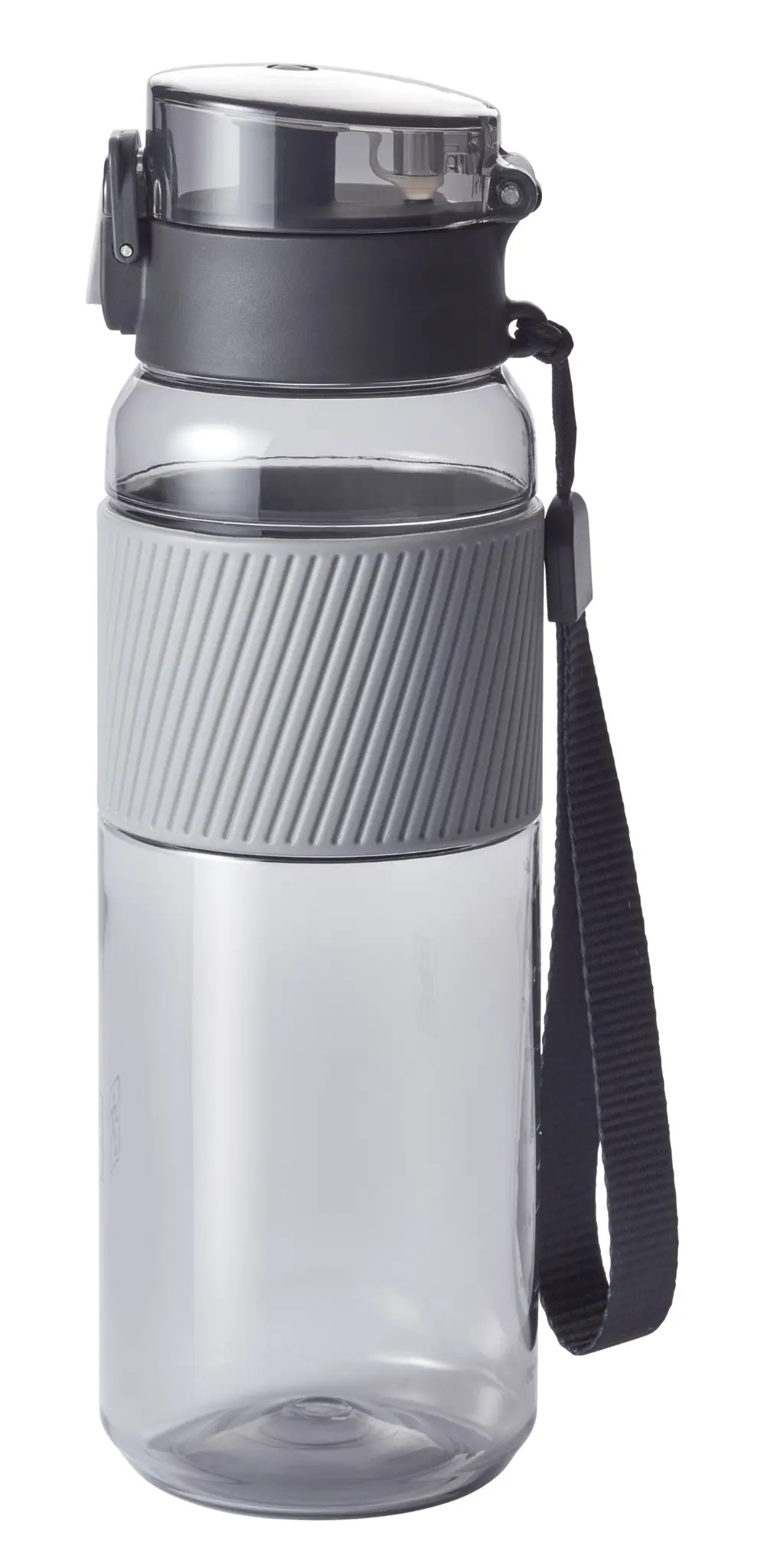 Prezentowany bidon w szarym kolorze wykonany został z wytrzymałego, nietłukącego się materiału - tritanu (bezpiecznego dla zdrowia tworzywa sztucznego bez BPA), który jest dodatkowo absolutnie bezwonny i bezsmakowy. Produkt jest łatwy w przenoszeniu. Można go bez trudu zmieścić w torbie lub plecaku, bądź transportować w dłoni lub na nadgarstku, dzięki zdejmowanemu paskowi. Samo trzymanie go w dłoni również będzie bezproblemowe i bezpieczne, zapewnia to antypoślizgowe silikonowe etui na całym obwodzie w górnej części. Komfort przenoszenia gwarantuje ponadto jego stuprocentowa szczelność. Na wygodę używania wpływa też możliwość otwierania jedną ręką. Szeroki otwór z kolei umożliwia łatwe napełnianie bidonu sokiem, herbatą, wodą lub innym niegazowanym napojem. Dodatkową zaletą produktu jest łatwość w czyszczeniu - pustą butelkę należy rozebrać na części i umyć pod bieżącą wodą lub z pomocą zmywarki. W komplecie dołączone zostało praktyczne sitko ułatwiające wlewanie soków owocowych, bez przejmowania się miąższem czy pestkami.