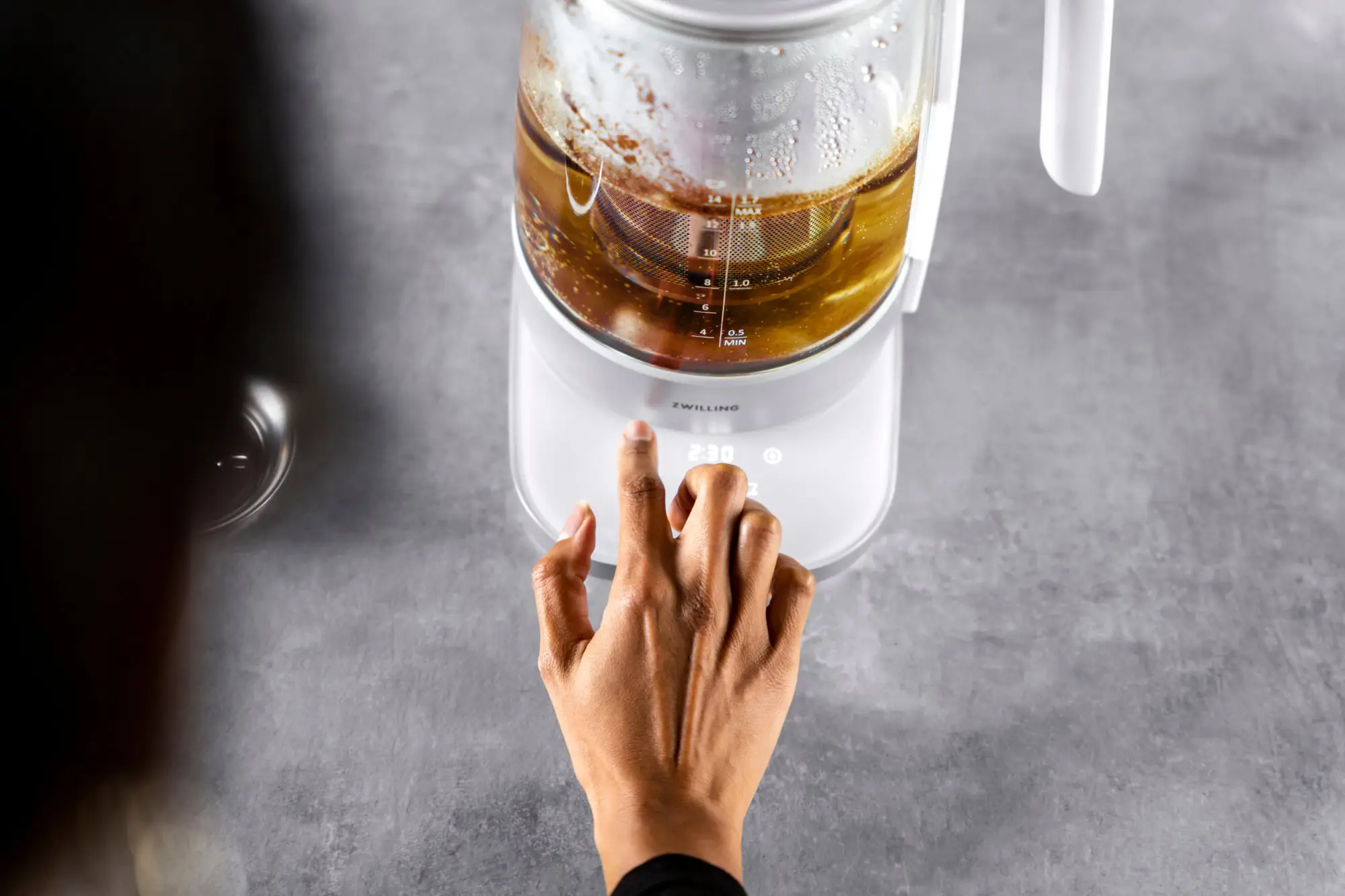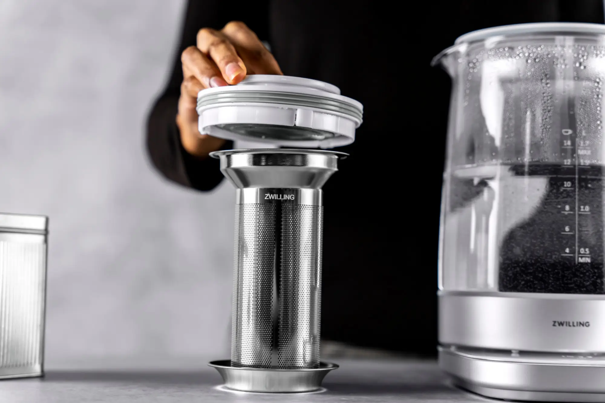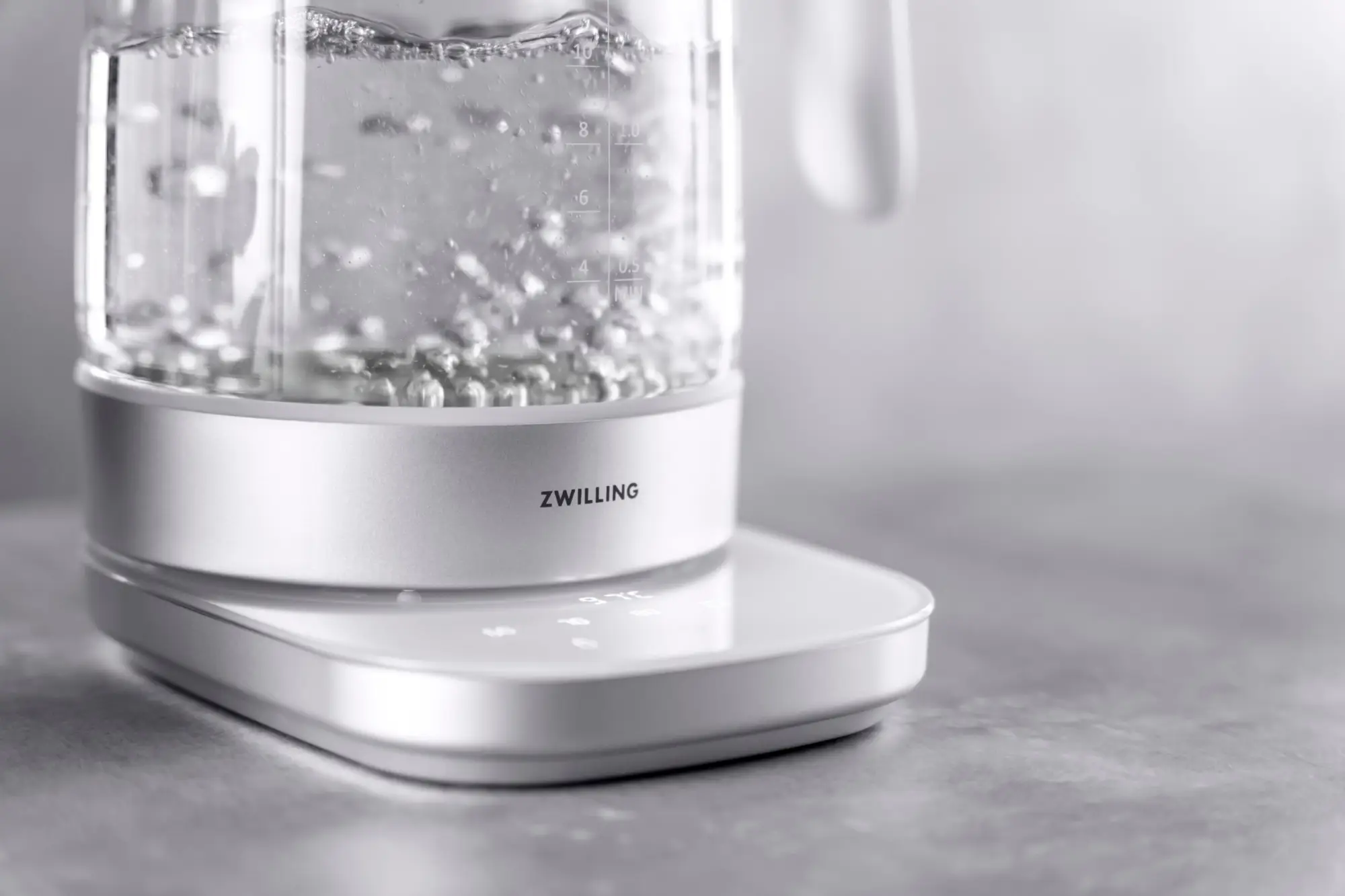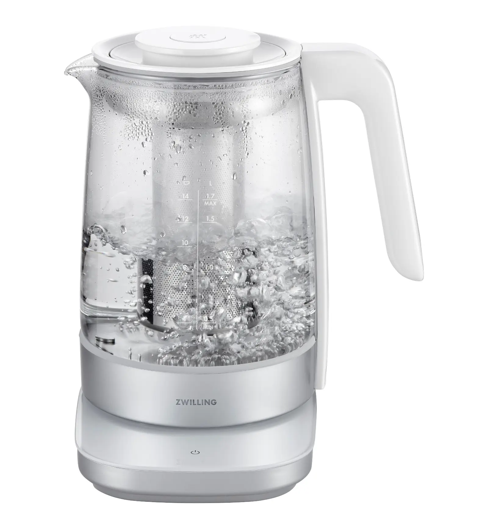 Opracowany przez ZWILLING w Niemczech, zaprojektowany w Mediolanie przez znany duet Matteo Thun i Antonio Rodriguezszklany czajnik elektryczny z linii Enfinigy o pojemności 1,7 L z wkładem do parzenia herbaty ze stali nierdzewnej, dzięki swojemu eleganckiemu, nowoczesnemu designowi wspaniale zaprezentuje się w kuchni. Jego elementy grzewcze wykonano ze szlachetnej stali nierdzewnej. Posiada on 10 programów oraz 6 poziomów temperatury (40°C, 60°C, 70°C, 80°C, 93°C, 100°C) oraz funkcje utrzymania temperatury na 30 minut i gotowania wstępnego do temperatury wrzenia.