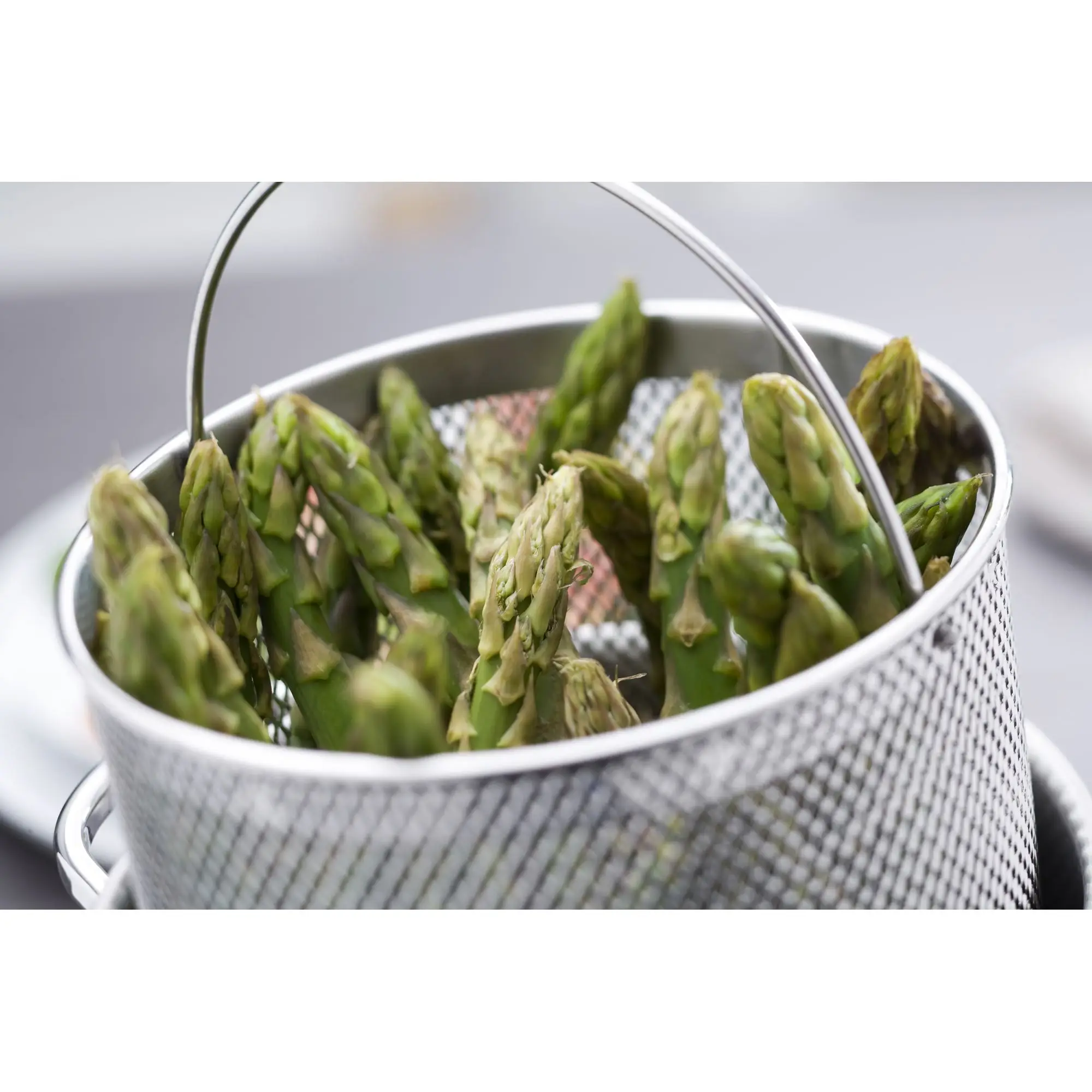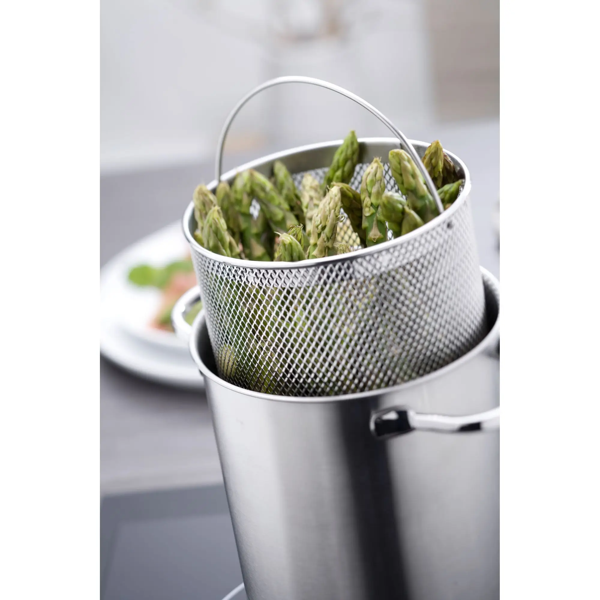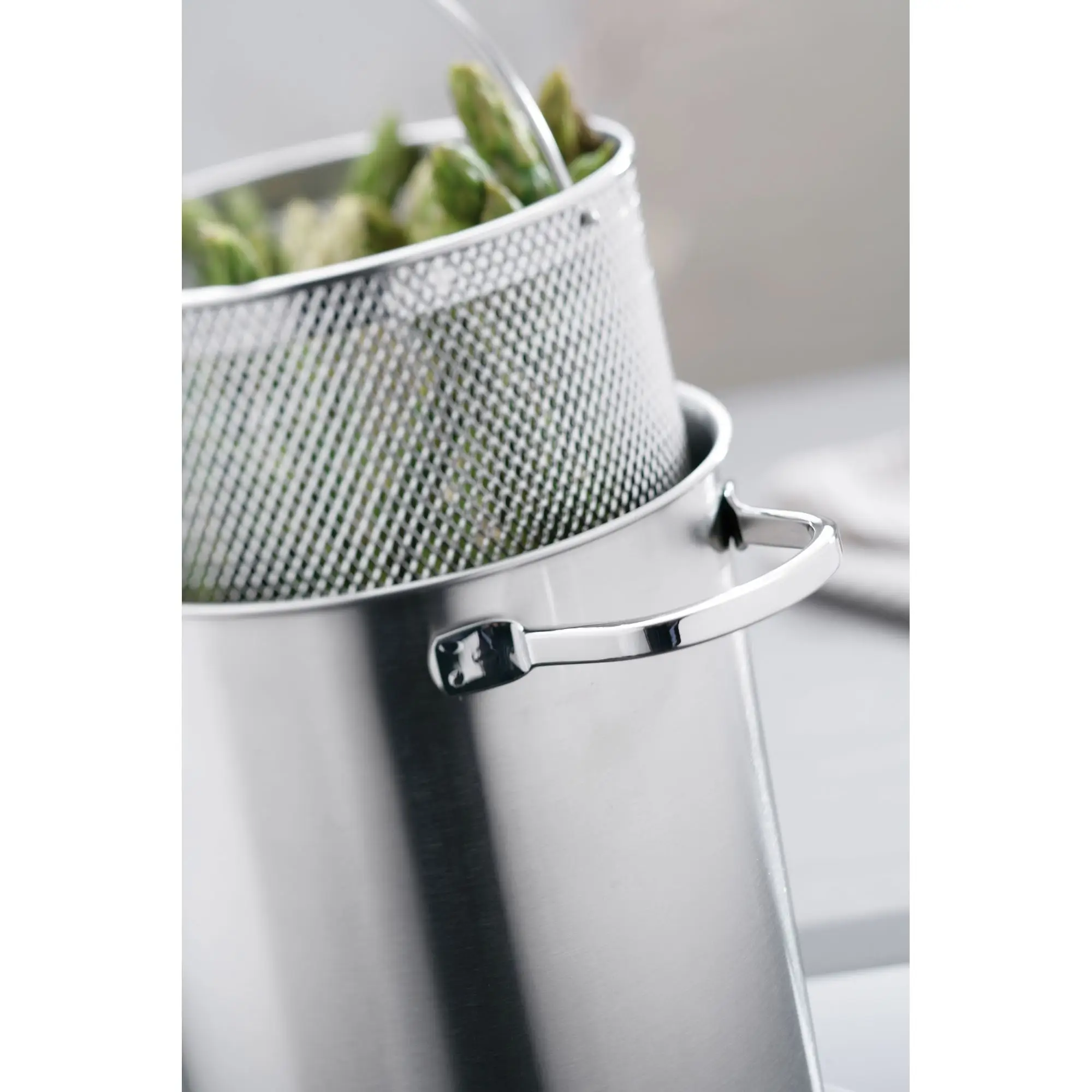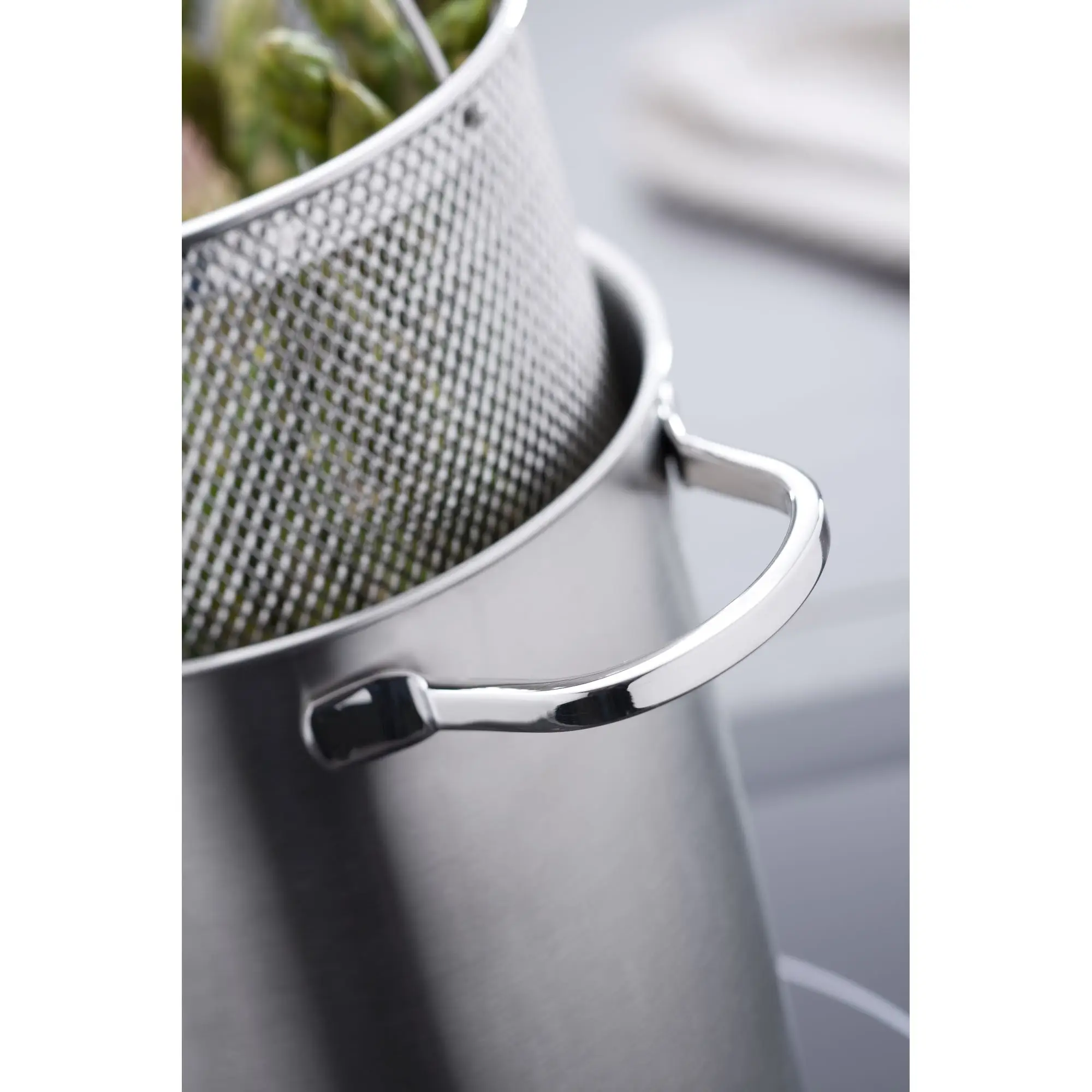 Wykonany został z najwyższej jakości stali nierdzewnej. Posiada masywną podstawę typu Cookstar, co zapewnia równomierne nagrzewanie się garnka i optymalne utrzymanie ciepła. Wyposażony jest w dwa wygodne, dobrze leżące w dłoni uchwyty, pokrywę oraz specjalny koszyk, za pomocą którego umieszcza się w garnku szparagi lub makaron. Przeznaczony jest do użytku na każdym rodzaju kuchenki; ceramicznej, gazowej, elektrycznej, a także indukcyjnej. Nadaje się zarówno do mycia ręcznego, jak i w zmywarce.
