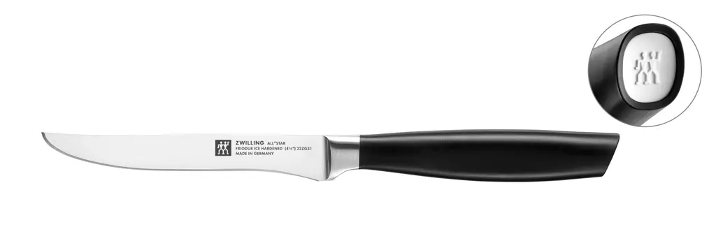 Noże marki Zwilling wyróżniają się wyjątkowo wysoką jakością materiałów wykonania, co przekłada się na ich funkcjonalność w kuchni domowej i profesjonalnej. Kolekcję All Star tworzą wszystkie popularne typy noży o wszechstronnym zastosowaniu. Ich minimalistyczny design z czarnymi uchwytami doskonale odnajdzie się zarówno w nowoczesnej jak i tradycyjnej kuchni. Nasadki na końcach rączek z wytłoczonym logo Zwilling stanowią stylowy akcent kolorystyczny.