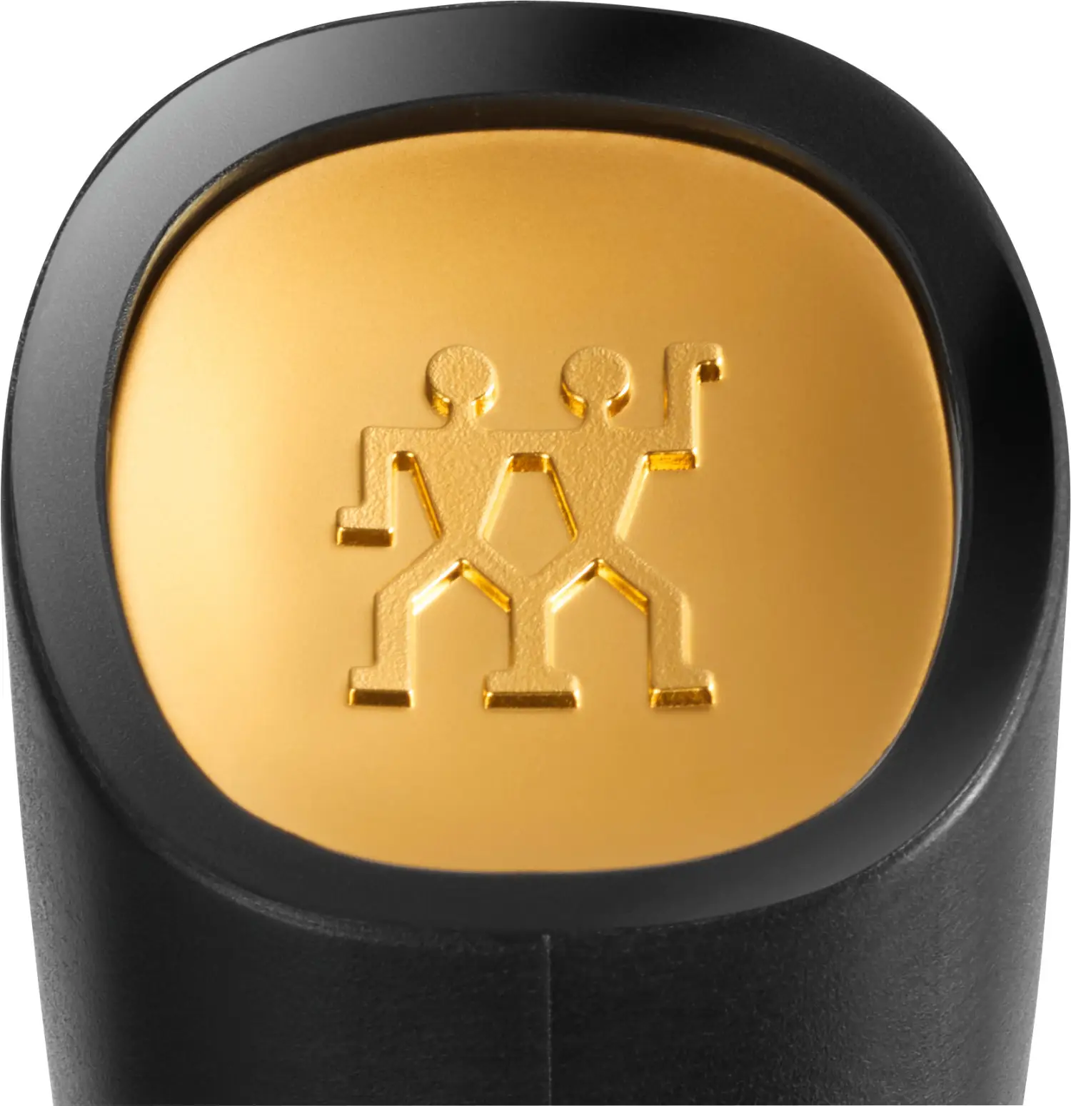 Prezentowany nóż do steków z nasadką w kolorze matowego złota ma hartowane lodem, wykonane ze specjalnego stopu ostrze FRIODUR® o długości 12 cm. Charakteryzuje się ono odpornością na korozję, trwałością i niezwykłą ostrością, dzięki czemu gładko przecina żywność. Ponadto nóż posiada ergonomiczną, dobrze leżącą w dłoni rączkę z najwyższej jakości tworzywa sztucznego, dzięki czemu nawet dłuższa praca z nim nie będzie wymagała za wiele wysiłku - poprawi to komfort spożywania steków. By zachować produkt w jak najlepszym stanie należy go myć wyłącznie ręcznie. W celu ochrony przed szybkim stępieniem i dla większego bezpieczeństwa zaleca się trzymanie go w bloku na noże. Nóż zapakowany został w opakowanie całkowicie wolne od plastiku - co jest jego dodatkową zaletą.