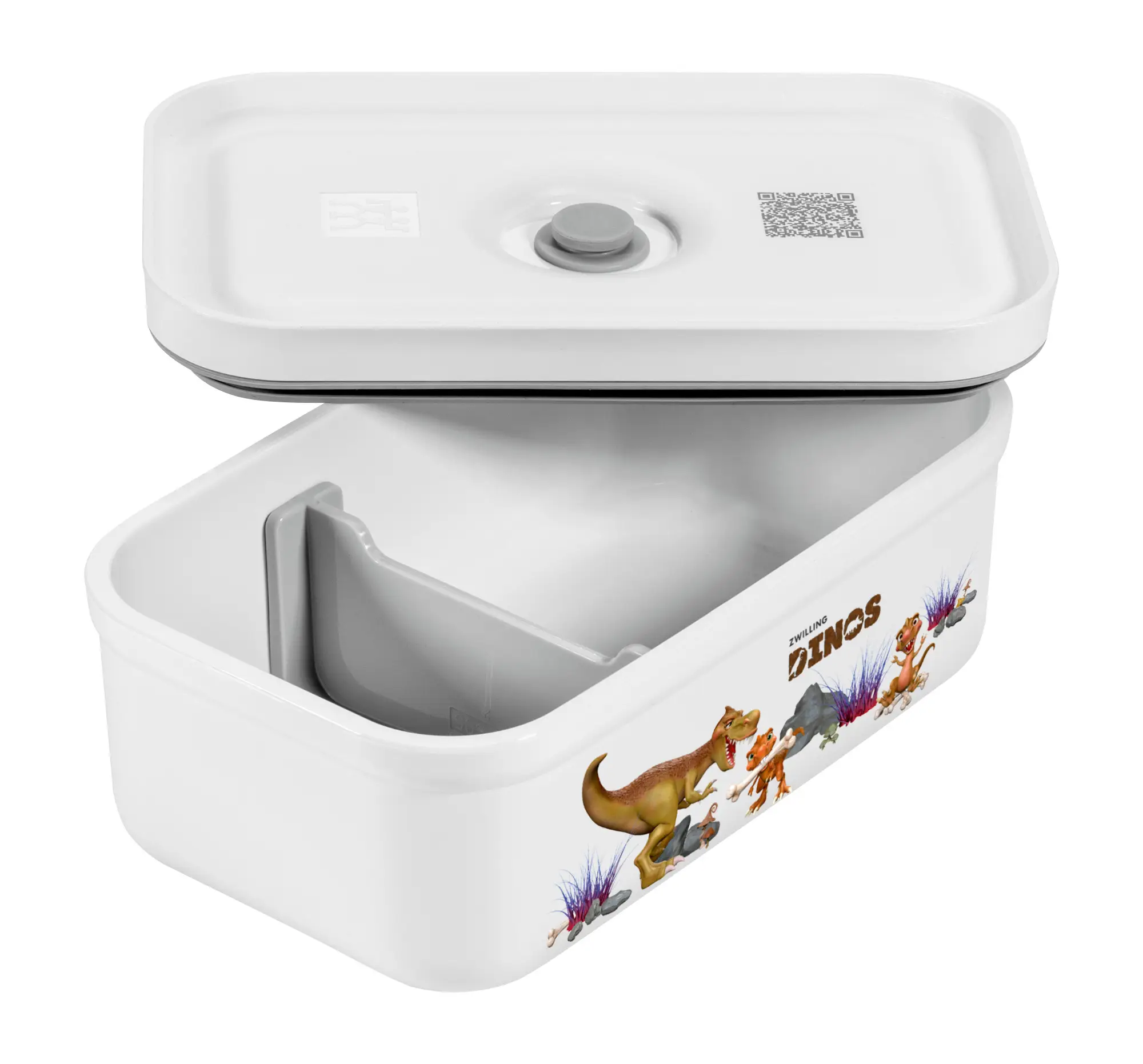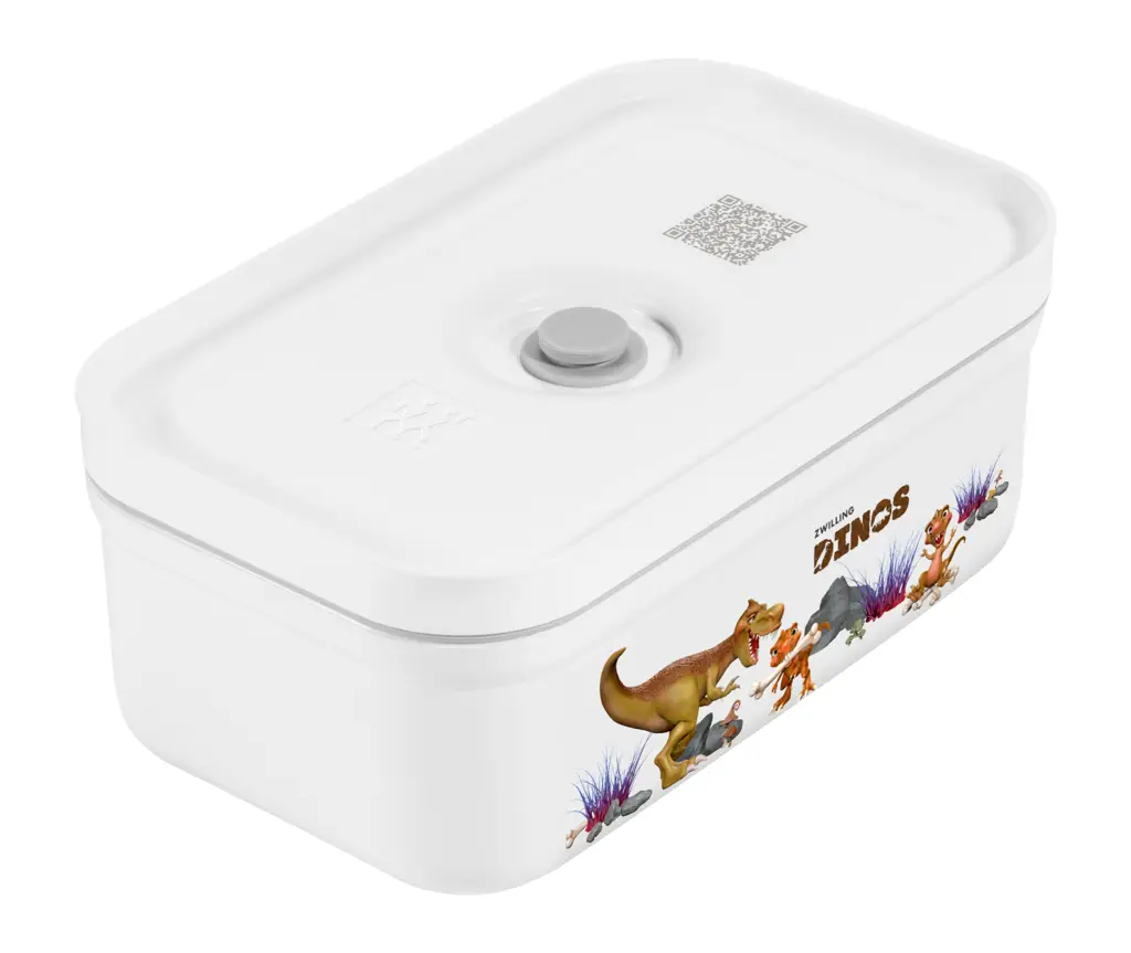Prezentowany pojemnik w białym kolorze o pojemności 800 ml z motywem Dinos idealnie nada się na posiłki dla dzieci, pozwalając na zachowanie ich aromatu i świeżości do pięciu razy dłużej - z pomocą pompki próżniowej (do kupienia osobno) można usunąć z jego wnętrza powietrze, co spowalnia proces utleniania żywności. Szczelność pokrywy uchroni przed niechcianymi przeciekami do plecaka lub torby, warto jednak transportować je poziomo. Pojemnik można bez obaw myć w zmywarce, co ułatwi czyszczenie. Z kolei możliwość używania w kuchence mikrofalowej pozwoli na podgrzanie posiłku, bez przekładania go do dodatkowego naczynia.