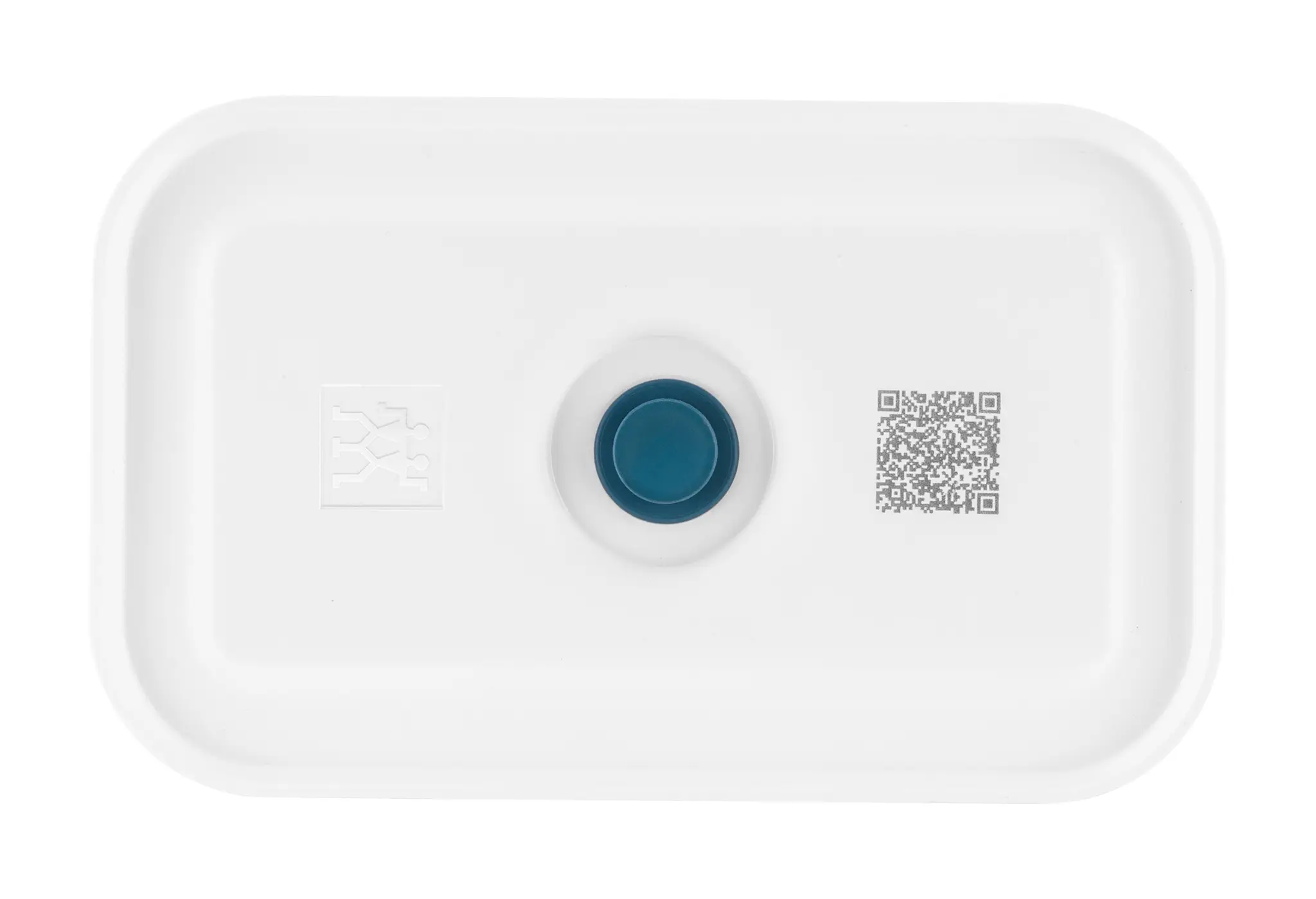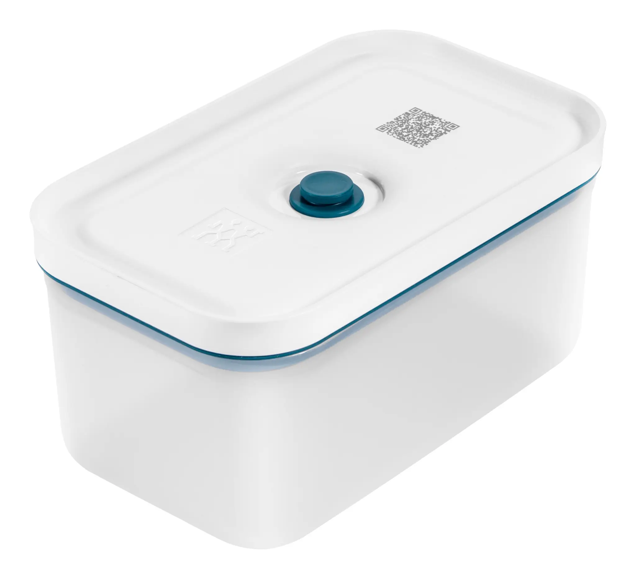 Prezentowany pojemnik do przechowywania żywności ma pojemność 0,9 L i dzięki funkcji próżni - posiada on specjalnie dostosowaną pokrywkę z silikonowymi uszczelkami w morskim kolorze, której innowacyjny zawór umożliwia odprowadzenie powietrza z pojemnika (przy pomocy nie dołączonej w komplecie pompki próżniowej FRESH & SAVE), co nawet pięciokrotnie spowolni proces utleniania się żywności, zachowując jej aromat i świeżość na dłużej. Ten praktyczny produkt nie zajmie wiele miejsca w lodówce, umożliwiając przechowywanie serów, wędlin czy resztek z sałatek i obiadów lub warzyw, ograniczając marnowanie żywności. W dodatku pojemnik będzie łatwy w czyszczeniu - można go myć w zmywarce oraz nada się do postawienia na stole, jako że estetycznie się prezentuje. Marka oferuje bezpłatną aplikację Zwilling Culinary World, dzięki której można wygodnie kontrolować termin przydatności przechowywanej w pojemnikach żywności.