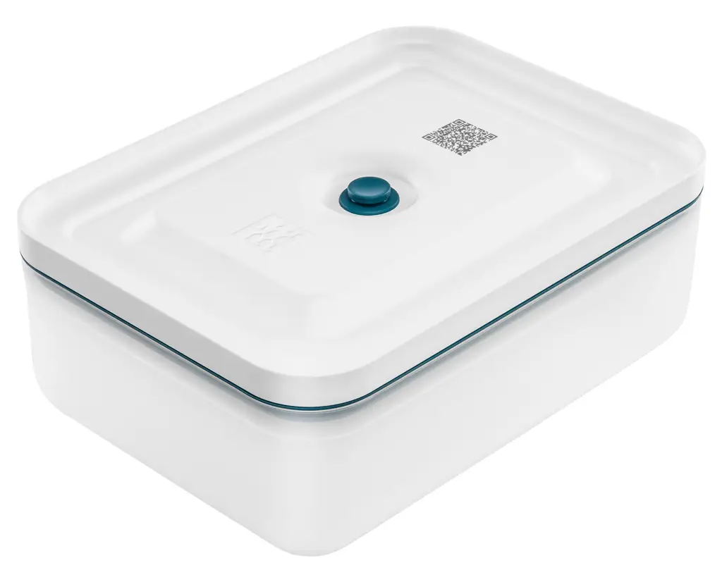 Prezentowany niski pojemnik do przechowywania żywności ma pojemność 2 L i dzięki funkcji próżni - posiada on specjalnie dostosowaną pokrywkę z silikonowymi uszczelkami w morskim kolorze, której innowacyjny zawór umożliwia odprowadzenie powietrza z pojemnika (przy pomocy nie dołączonej w komplecie pompki próżniowej FRESH & SAVE), co nawet pięciokrotnie spowolni proces utleniania się żywności, zachowując jej aromat i świeżość na dłużej. Ten praktyczny produkt nie zajmie wiele miejsca w lodówce, umożliwiając przechowywanie serów, wędlin czy resztek z sałatek i obiadów lub warzyw, ograniczając marnowanie żywności. W dodatku pojemnik będzie łatwy w czyszczeniu - można go myć w zmywarce oraz nada się do postawienia na stole, jako że estetycznie się prezentuje. Marka oferuje bezpłatną aplikację Zwilling Culinary World, dzięki której można wygodnie kontrolować termin przydatności przechowywanej w pojemnikach żywności.