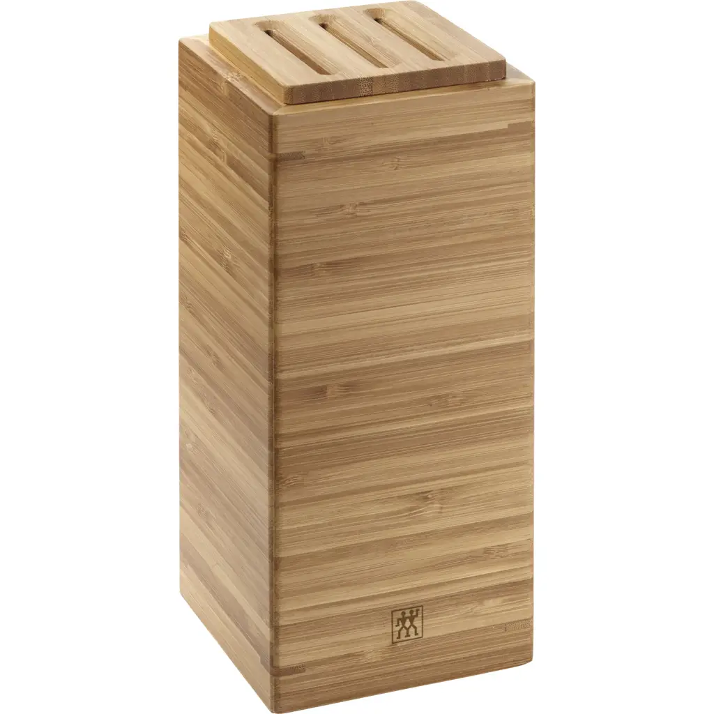Ten stylowy i elegancki pojemnik przeznaczony jest do przechowywania narzędzi kuchennych, takich jak noże czy tasaki. Wykonano go z drewna bambusowego, z posklejanych ze sobą kawałków. Posiada pokrywkę z otworami na akcesoria. Świetnie prezentuje się na każdym blacie kuchennym.