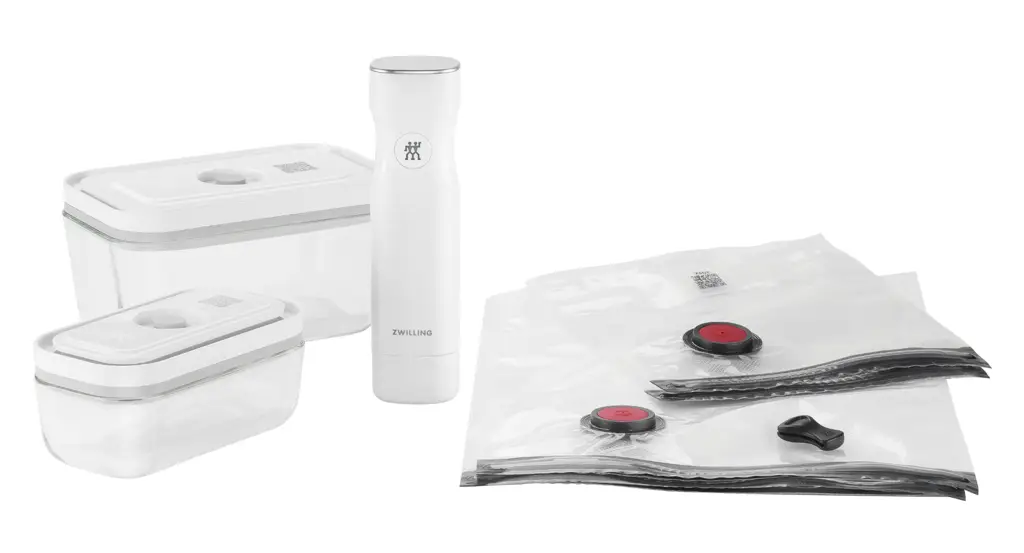Prezentowany zestaw zawiera: 2 pojemniki w rozmiarach S (poj. 350 ml) i M (poj. 750 ml) ze szkła borokrzemowego i tworzywa bez BPA, 4 wielorazowych woreczków próżniowych w dwóch rozmiarach (S - 23 x 20 cm i M - 35 x 25 cm) oraz poręcznej pompki do odprowadzania powietrza z dołączonym kablem do ładowania. Pozwoli on na komfortowe przechowywanie żywności w lodówce oraz zamrażalce, oszczędzając miejsce i utrzymując świeżość nawet pięciokrotnie dłużej. Można więc będzie przygotować posiłki na zapas. Nowoczesny wygląd pojemników sprawia, że nie trzeba będzie używać dodatkowych naczyń podczas serwowania. Zestaw nadaje się także do używania w kuchence mikrofalowej, a torebki próżniowe mogą posłużyć również do gotowania metodą sous-vide w temperaturze do 100°C. Dodatkowo pojemniki można myć przy pomocy zmywarki, co ułatwi ich czyszczenie. Zaletą produktu jest możliwość połączenia go z darmową aplikacją producenta ZWILLING Culinary World, która pozwala na wygodne śledzenie przydatności do spożycia. Doskonale sprawdzi się dla osób pragnących zadbać o zrównoważone i zdrowe żywienie.