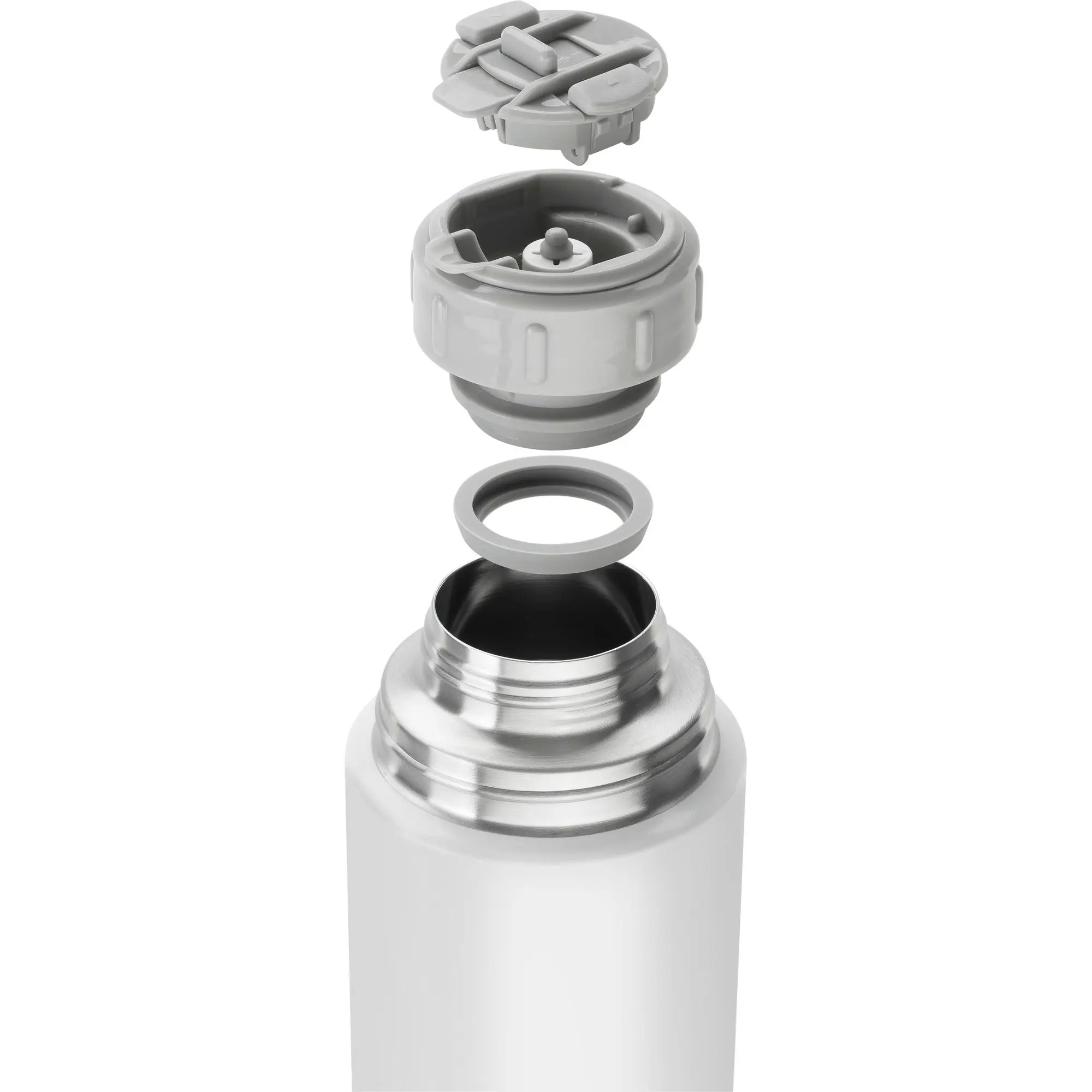 Termos z kubkiem 1 L Thermo biały wykonany został ze stali nierdzewnej, posiada szczelnie zakręcaną nakrętkę z otwieraną wylewką. Zabezpieczająca blokada gwarantuje bezpieczne przechowywanie gorącego płynu. Naczynie to wyposażone jest w kubek z tworzywa sztucznego, a pod jego spodem znajduje się antypoślizgowa podstawa. Termos ten utrzymuje ciepło czasie od 7 do 12 godzin.