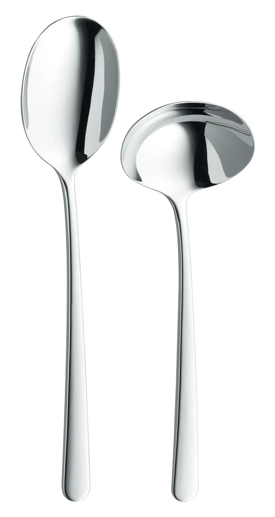 Prezentowany zestaw 2-częściowy do zupy zawiera chochlę oraz łyżkę. Doskonale nada się on zarówno do jej przygotowywania jak i nalewania, zapewniając przy tym odpowiednio estetyczną prezentację. Oba elementy wykonano z najwyższej jakości stali nierdzewnej, czemu są odporne na kwasy z żywności oraz rdzewienie. Dodatkowo zapewnia to trwałość na lata - przy prawidłowym korzystaniu i pielęgnacji. Zestaw sprawdzi się jako uzupełnienie posiadanych sztućców o podobnym designie, dzięki ergonomicznym rączkom pozwalając na komfortowe używanie. Dodatkowo jest on łatwy w czyszczeniu - nadaje się do mycia w zmywarce.
