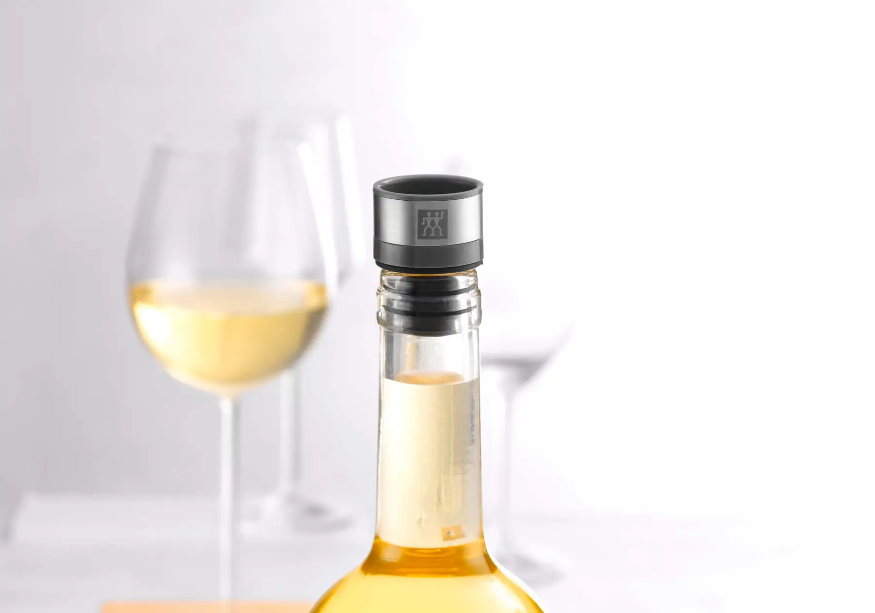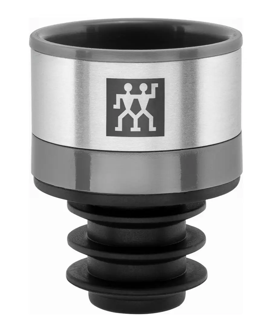 Obsługa pompy bezprzewodowej* i próżniowej zatyczki jest wyjątkowo prosta oraz szybka – podobnie jak odkorkowanie. Wystarczy umieścić korek na szyjce butelki, po czym przy użyciu jednego przycisku wypompować z niej powietrze. Producent zapewnia także możliwość połączenia otwartych butelek z bezpłatną aplikacją Zwilling Culinary World w celu kontrolowania przydatności napoi.