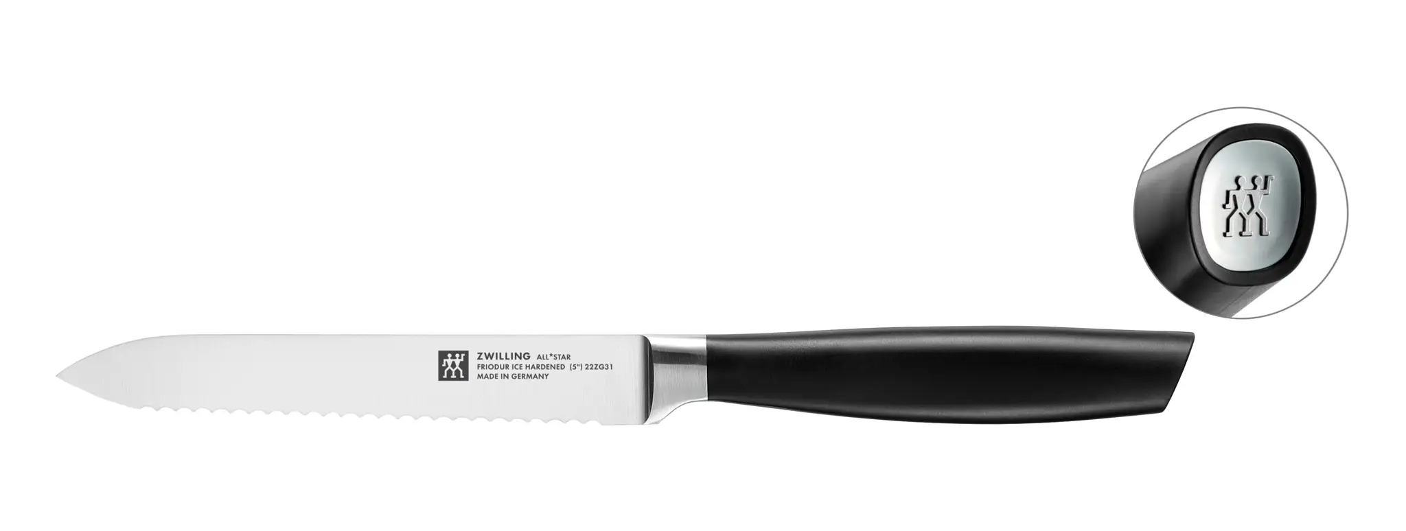 Noże marki Zwilling wyróżniają się wyjątkowo wysoką jakością materiałów wykonania, co przekłada się na ich funkcjonalność w kuchni domowej i profesjonalnej. Kolekcję All Star tworzą wszystkie popularne typy noży o wszechstronnym zastosowaniu. Ich minimalistyczny design z czarnymi uchwytami doskonale odnajdzie się zarówno w nowoczesnej jak i tradycyjnej kuchni. Nasadki na końcach rączek z wytłoczonym logo Zwilling stanowią stylowy akcent kolorystyczny.