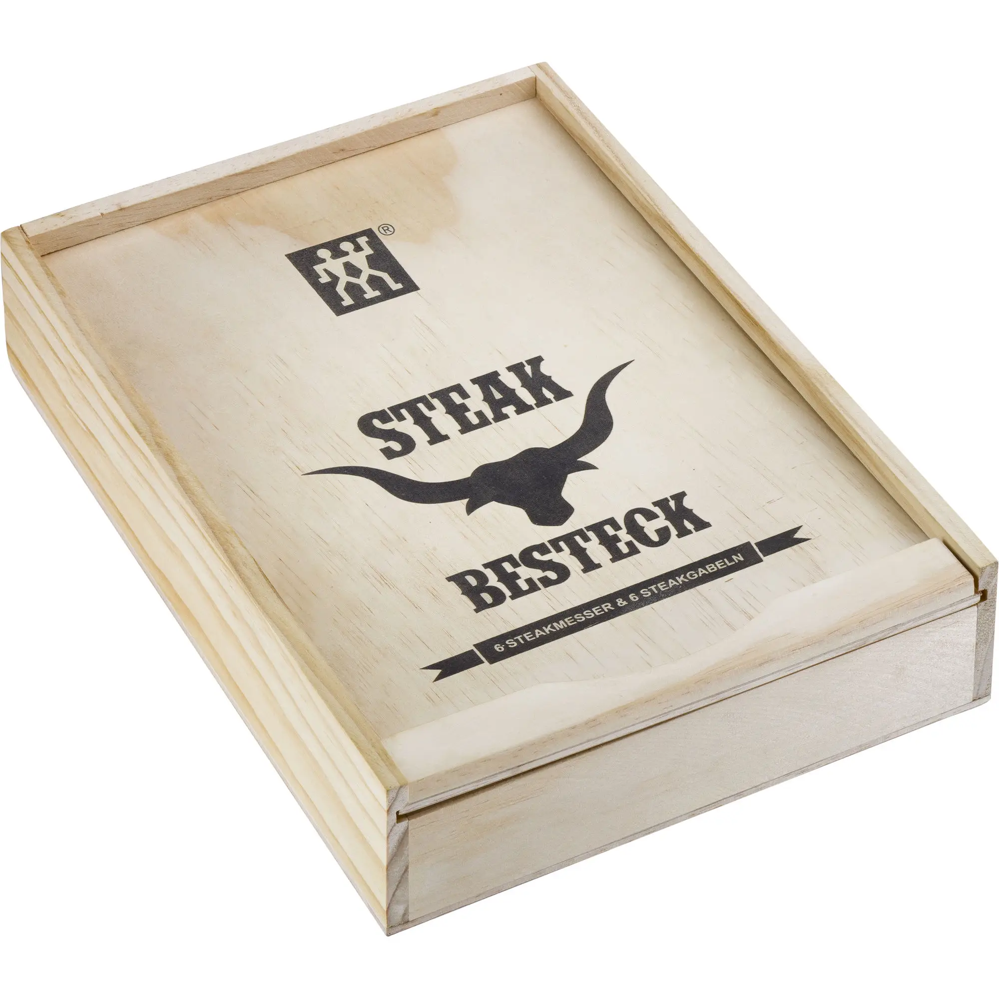Zestaw wykonany został ze szlachetnej stali matowej, odpornej na korozję. Jest niezastąpionym dodatkiem obiadowego nakrycia, w czasie serwowania steków. Zestaw przeznaczony jest dla sześciu osób, składa się z sześciu widelców i sześciu noży; całość zapakowana jest w eleganckie pudełko. Sztućce nadają się do mycia w zmywarce.
